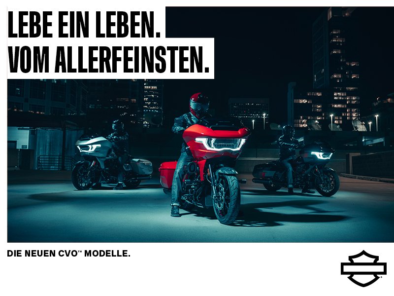 Alle CVO™ Modelle sind jetzt in exklusiven neuen Farbvarianten erhältlich. Noch aufregender im Finish sind jetzt also: • Die CVO™ Pan America® • Die CVO™ Street Glide® • Die CVO™ Road Glide® • Die CVO™ Road Glide® ST
