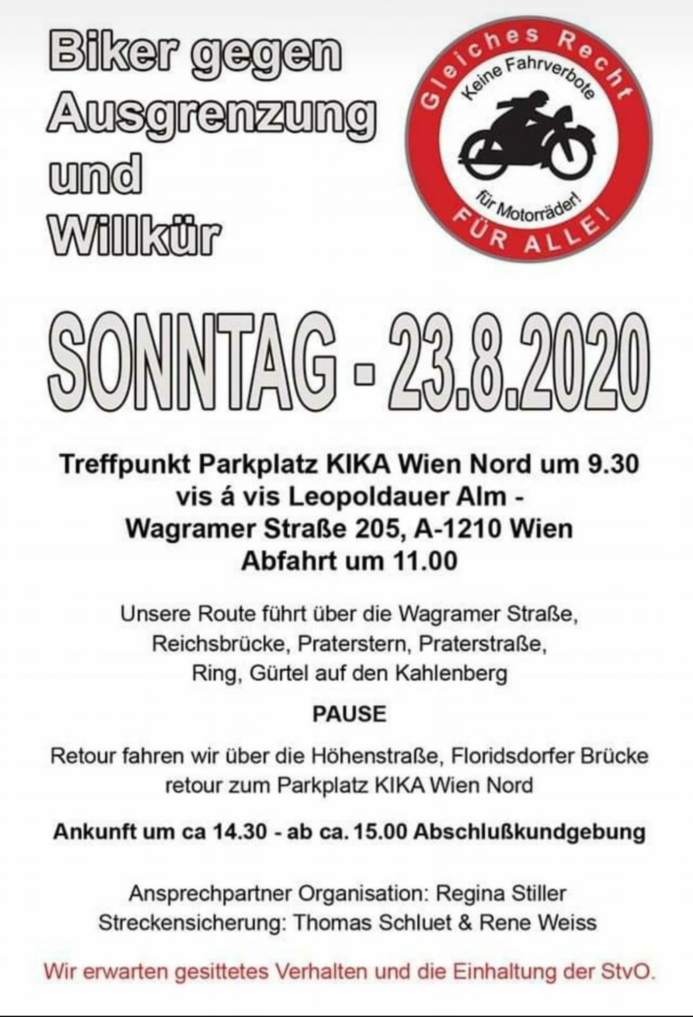 Es hat sich eine private Initiative mit dem Namen „Biker gegen Ausgrenzung und Willkür“ gebildet, die am Sonntag, den 23. August eine Demonstration/Motorradfahrt organisiert hat. Wir unterstützen diese Demo, weil es nicht sein kann, dass wir jede Menge Steuern an den Staat abliefern und genau dieser Staat verbietet uns anschließend, mit legal erworbenen Bikes, die von ebendiesem Staat homologiert wurden, zu fahren!